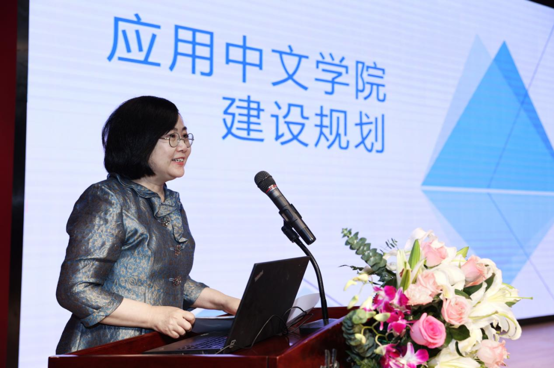 院长苏英霞教授对学院建设的必要性、可行性、学院定位、建设目标、主要任务等进行了系统阐述。她说,学院是实体性教学科研机构,以服务国家战略,助力各国经济发展,促进中外民心相通为办学宗旨,培养具有全球视野人文情怀,了解中国国情文化,具备中文语言交际能力和跨文化能力,具备较为完备的专业知识与技能,能熟练运用中文从事专业领域工作,服务于中外文化与经济交往和各国共享发展大局的应用型、复合型、创新型国际人才。学院建设以中文与专业职业相融通,突出应用为特色,将采取灵活开放的国际合作、校际合作、校企合作等办学模式。常规课程与定制课程,线上课程与线下课程,知识课程与实践课程相结合的开放型的课程体系,实施“中文+”融合型教育,提升中文使用价值和实用价值,增强国际中文教育和职业教育的全球适应性,扩大中国教育品牌整体国际影响力。