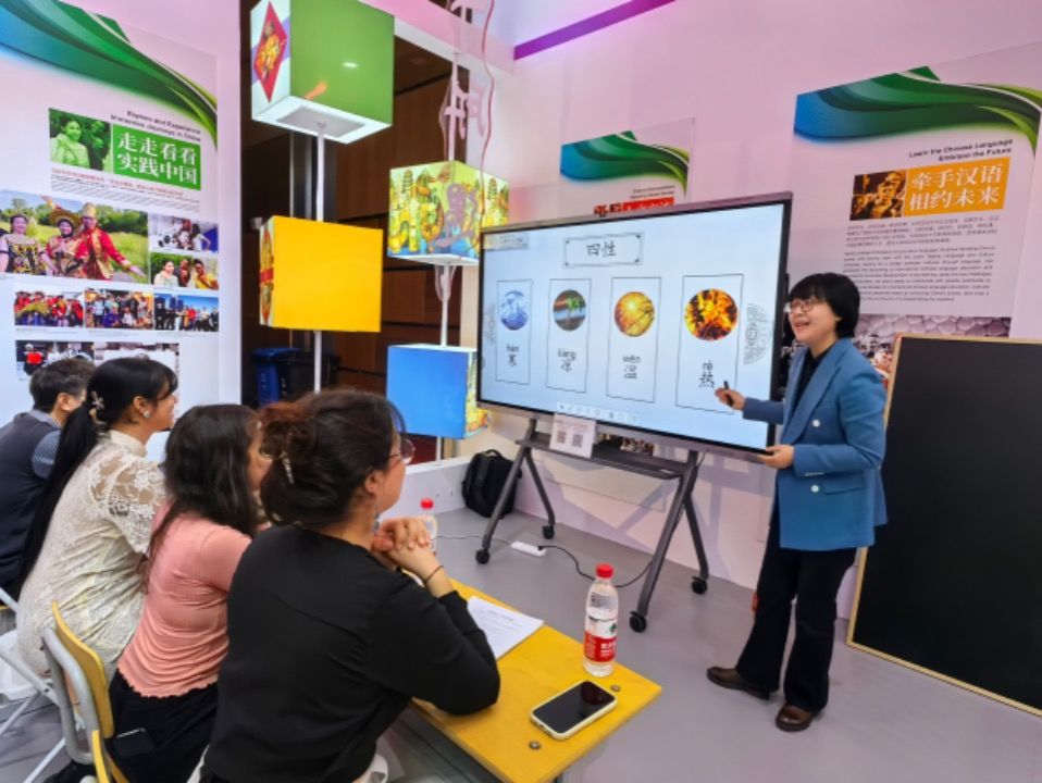 种一凡和张倩老师受五洲汉风教育科技有限公司委托,在大会发布区进行虚拟仿真中文教学项目成果展示。