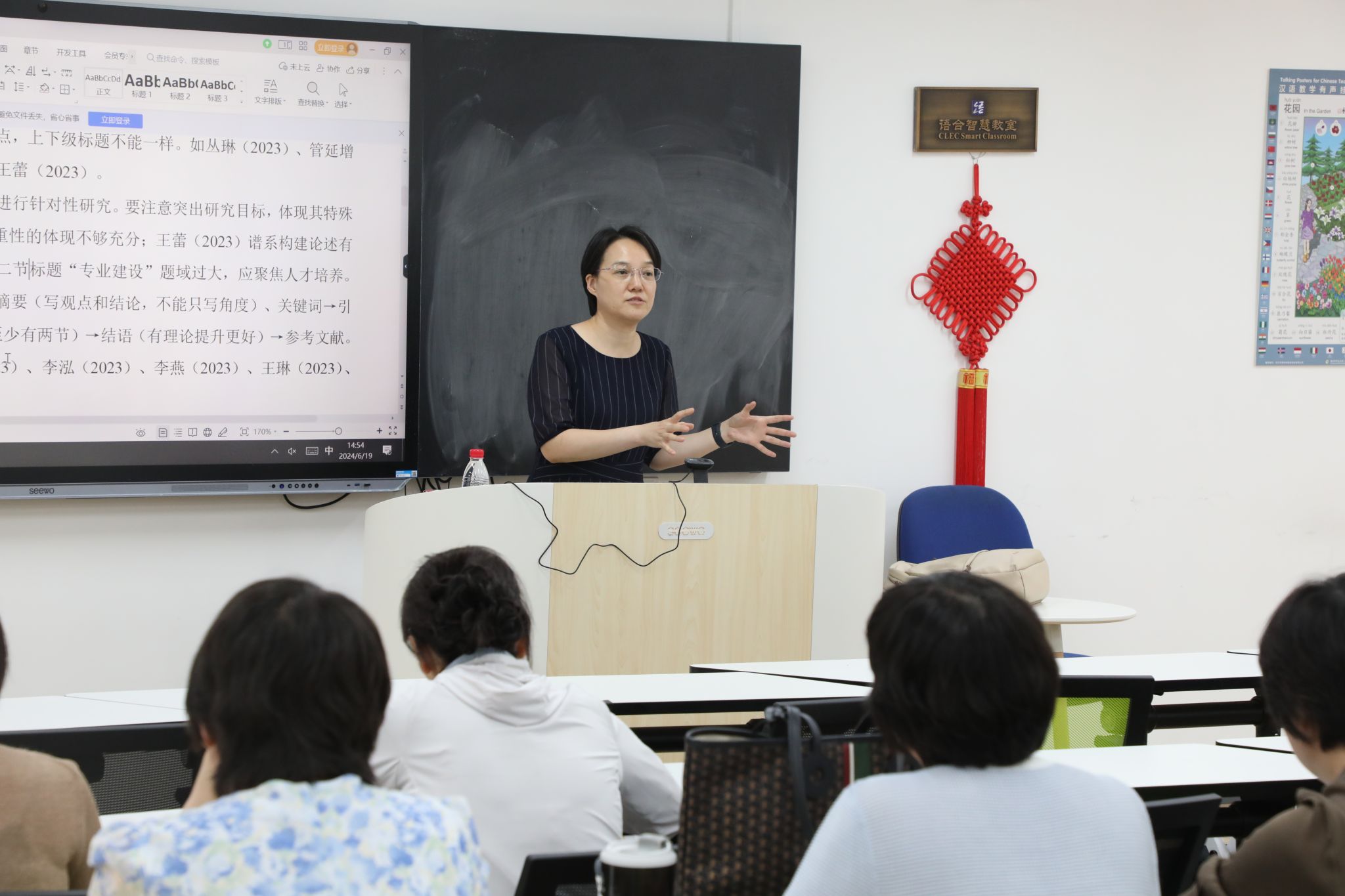 2024年6月19日下午,av在线看 在教五楼智慧教室举办了春季学期科研沙龙。本次沙龙特邀《世界汉语教学》编辑部孟凯研究员作为主讲人,对学院2023年度科研报告会一、二等奖论文进行评析。沙龙由av在线看 副院长朱文文主持,近二十位老师参加了此次活动。