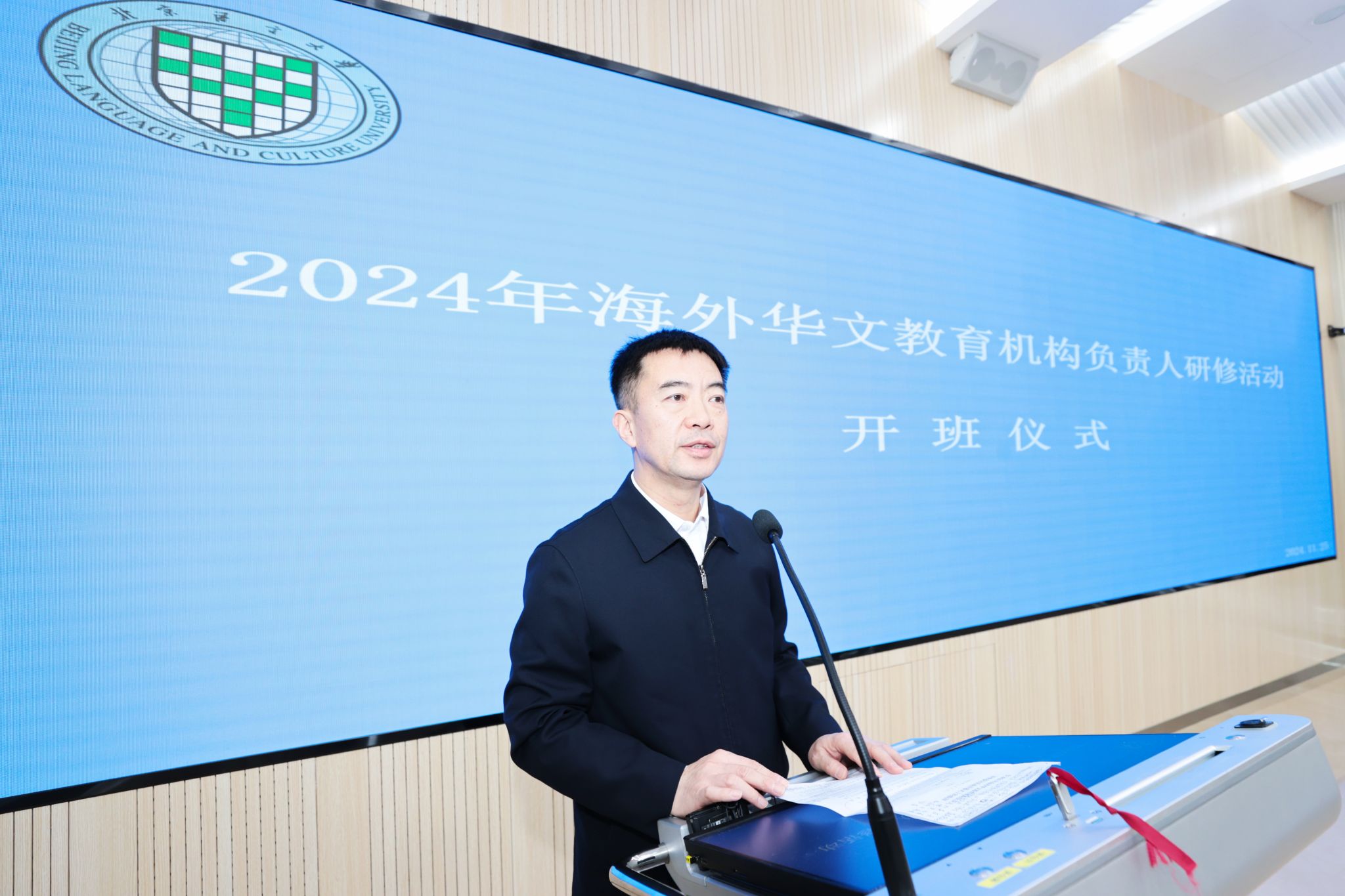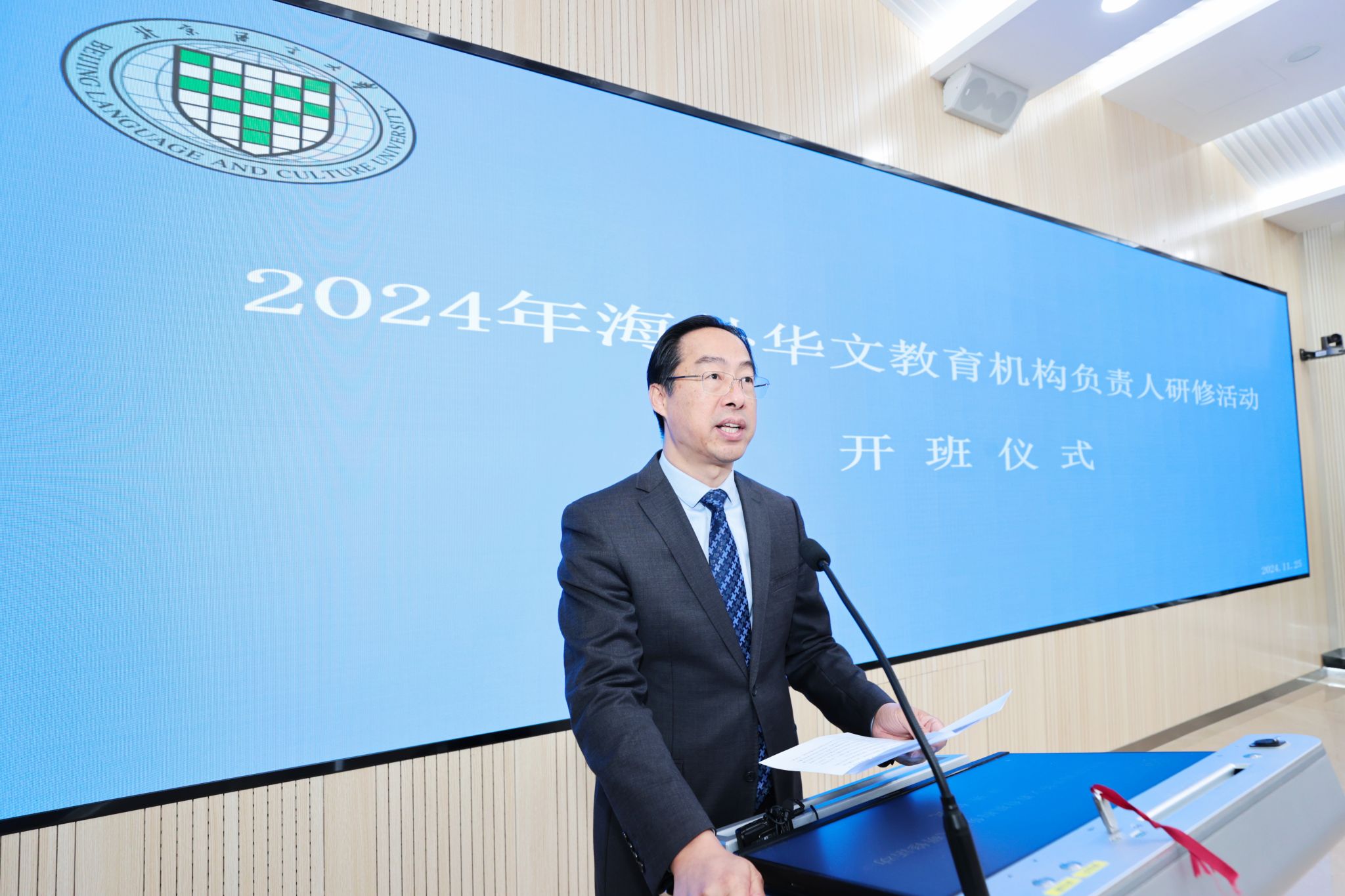 开班式上,黄益方副校长发表致辞,对参加此次研修活动的海外华文教育工作者致以热烈欢迎,并向北京市侨办一直以来对学校华文教育事业的关心和支持表示衷心感谢。他指出,华文教育对于薪传民族文化、促进海外侨胞与祖(籍)国的情感联系、增进中国与世界各国的友谊与交流发挥着重要作用,要不断自我革新,适应时代发展要求,提升国际传播能力和影响力,抓住机遇书写好新的辉煌篇章。黄益方副校长对学员们在海外数十年如一日推广普及华文教育的坚守与奉献表示敬佩,希望他们在本次研修活动中乐学善思、在未来的工作中笃行日新,以对华文教学事业高度的责任心和深切的情怀,促进中华文化与各国优秀文化的文明互鉴,生动讲述好中国故事,展现真实、立体、全面的中国。