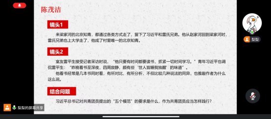 接着,五位同学就阅读时感触颇深的文章片段,结合自身经历和体悟,结合《团员和青年主题教育思考研讨重点内容参考》,分享了自己在阅读《习近平的七年知青岁月》时的心得体会。