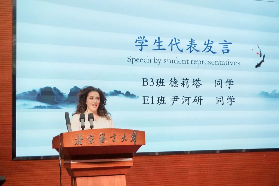 在结业典礼上,苏英霞院长首先为本学期做了总结发言,鼓励留学生们将所学知识运用到实际生活中,为促进中外文化交流和推动世界和平与发展贡献力量,并给同学们送上了美好的祝福。